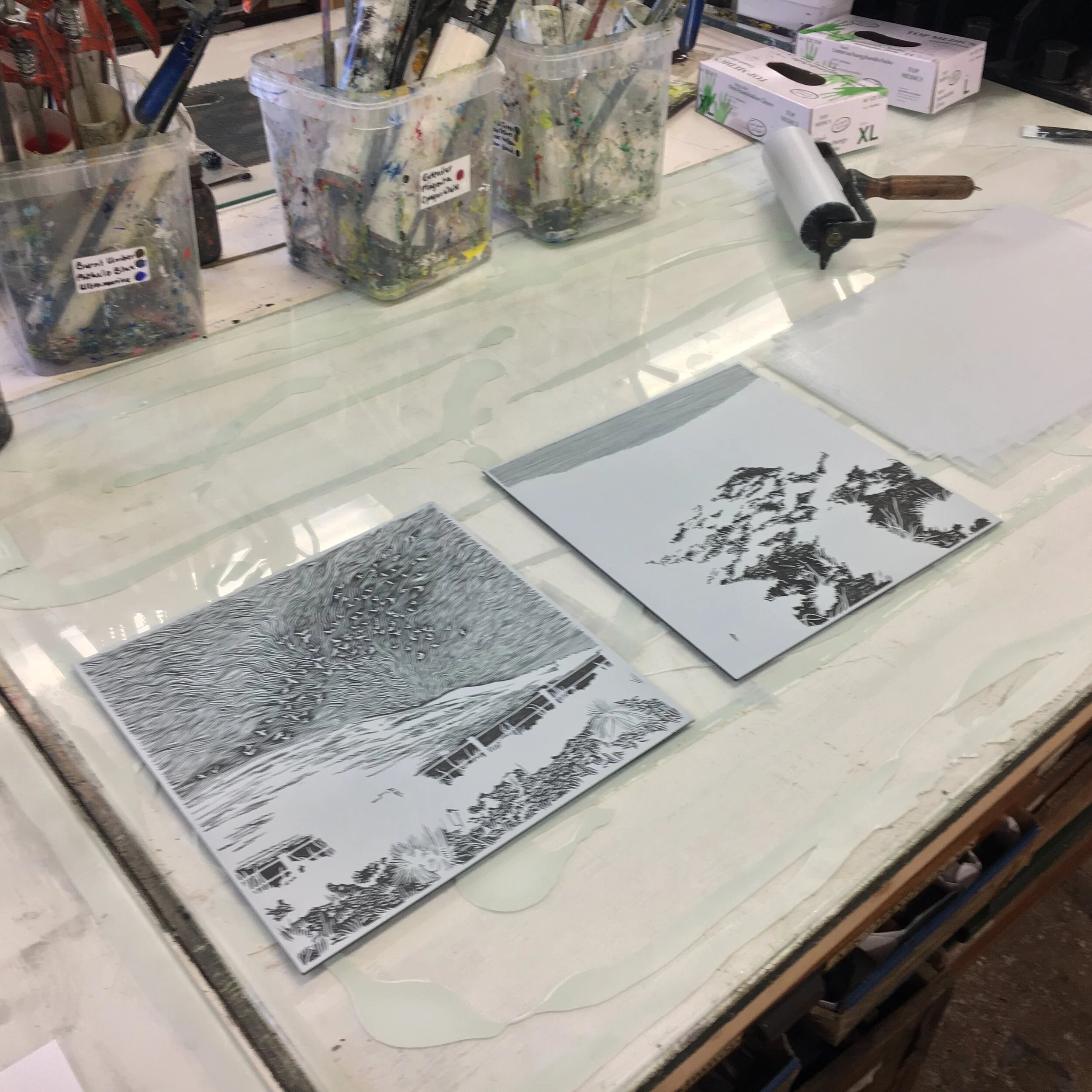 The printed image measures 30cm wide x 30cm high and is created using both sides of a panel of Japanese vinyl linocut, printed by hand, using a Slama 60 hand press with relief inks onto Heritage 135gsm paper.